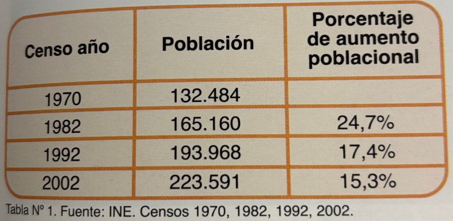 Esta tabla muestra la cifra de población arrojada por los últimos cuatro Censos de Población y Vivienda, como también el porcentaje de aumento de la población entre un período de medición y otro.